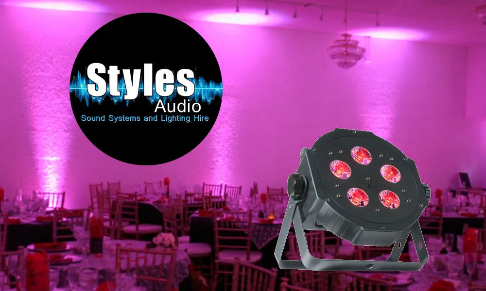 Uplighting hire & Mood lighting from Styles Audio Exeter for your wedding, Party or event covering the South West. These plug-and-play wall washers throw colour across the walls and ceilings, reflecting shadows and highlighting curves and features of a room. You can set any colours to suit your room and even change the colour of the light during an event to move the party on from brighter colours during the day to more warm colours at night. Up-lighters can also be used during discos and parties, changing colour in time with the music.