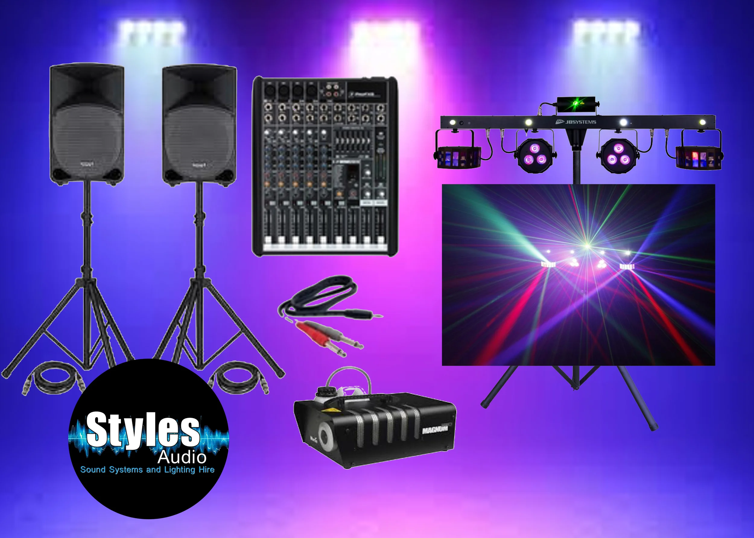 Styles Audio have this excellent quick set up package for parties, weddings and events. Connect your laptop/Mp3 player with the provided leads. If it has a standard headphone socket then it will work with our iPod Disco equipment, which is suitable for parties of up to 100 people. Also in the package is a JB PARTY BAR, PLUG IN AND GO LIGHTING SOLUTION and also you get a smoke machine with 1 litre of free fog juice. Its a perfect combo for a great party.